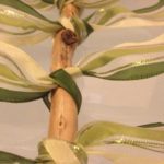 Lehántoltunk egy kb. 15 cm-s botot. 1 m hosszú szalagot méretre vágtam: először egy hosszabbat, aztán annál kicsit rövidebbet, majd még rövidebbet… összesen öt darabot. Majd egyenként rácsomóztuk a botra.